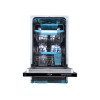 Устройство бережно очищает даже самую хрупкую посуду, нейтрализует стойкие пятна и экономит воду — достаточно выбрать подходящий режим. Для компактного расположения столовых приборов предусмотрен отдельный лоток. Конструкция предусматривает полку для чашек и держатель для бокалов. Ионообменник тщательно смягчает воду, исключая вероятность появления накипи на внутренних элементах. Специальные индикаторы показывают, когда нужно добавить моющие средства. Звуковой сигнал оповестит, когда пришло время вынимать чистую и сухую кухонную утварь.